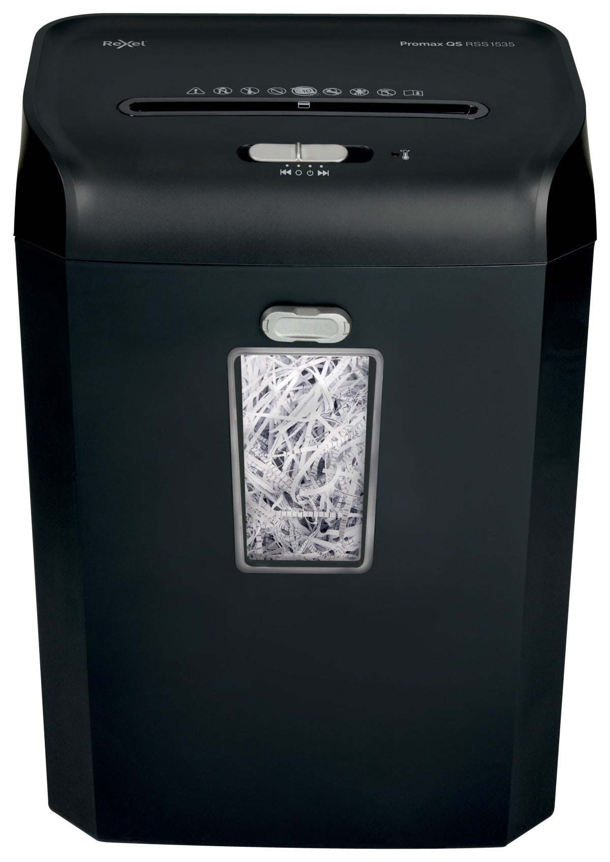 Distrugatorul manual pentru documente Rexel ProMax QS RSS1535 distruge pana la 15 coli A4 (80 gsm) dintr-o singura incarcare. Nivel de securitate DIN P-2 (6mm) strip cut (taiere tip fasii) si capacitate cos de 35L (300x coli A4).