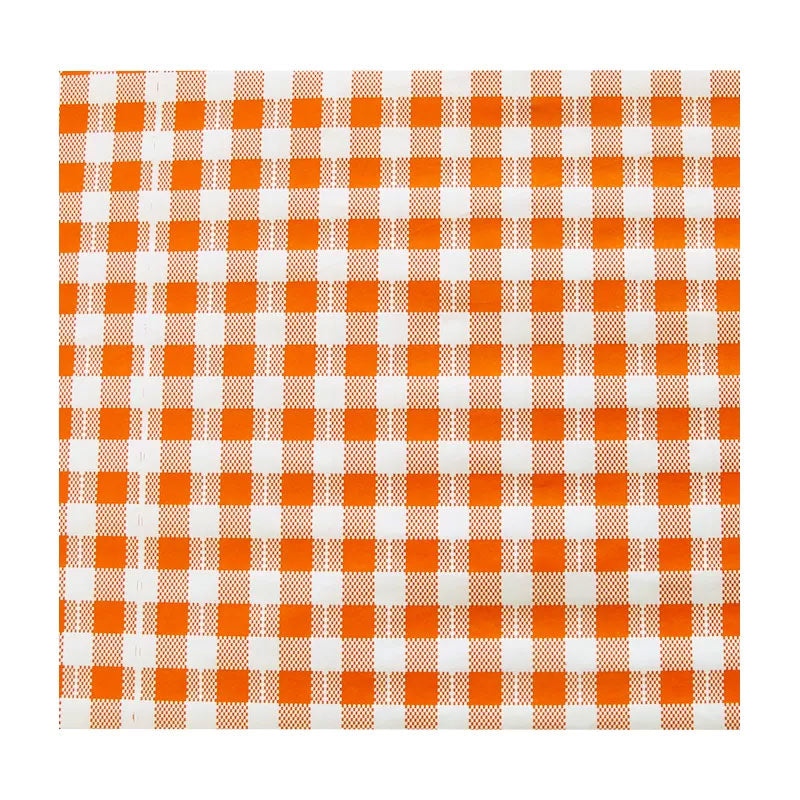 Fata de masa fabricata din hartie cu polietilena, imprimata in model cu carouri. Fata de masa este disponibila in varianta de culoare portocalie. Dimensiunile fetei de masa sunt urmatoarele: 88 x 100 cm.