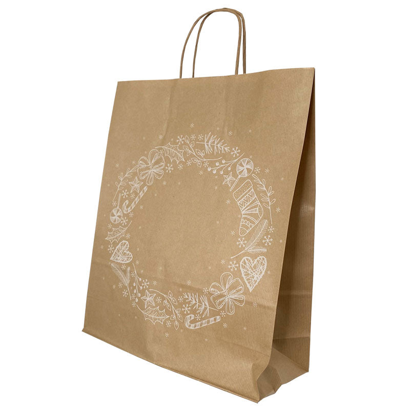 Punga hartie cadou cu maner rasucit cu dimensiunile de 32 x 12 x 41 cm, de culoare maro cu motive de Craciun cu interiorul maro. Grosime hartie 90-100 gr/m2. Material rezistent.