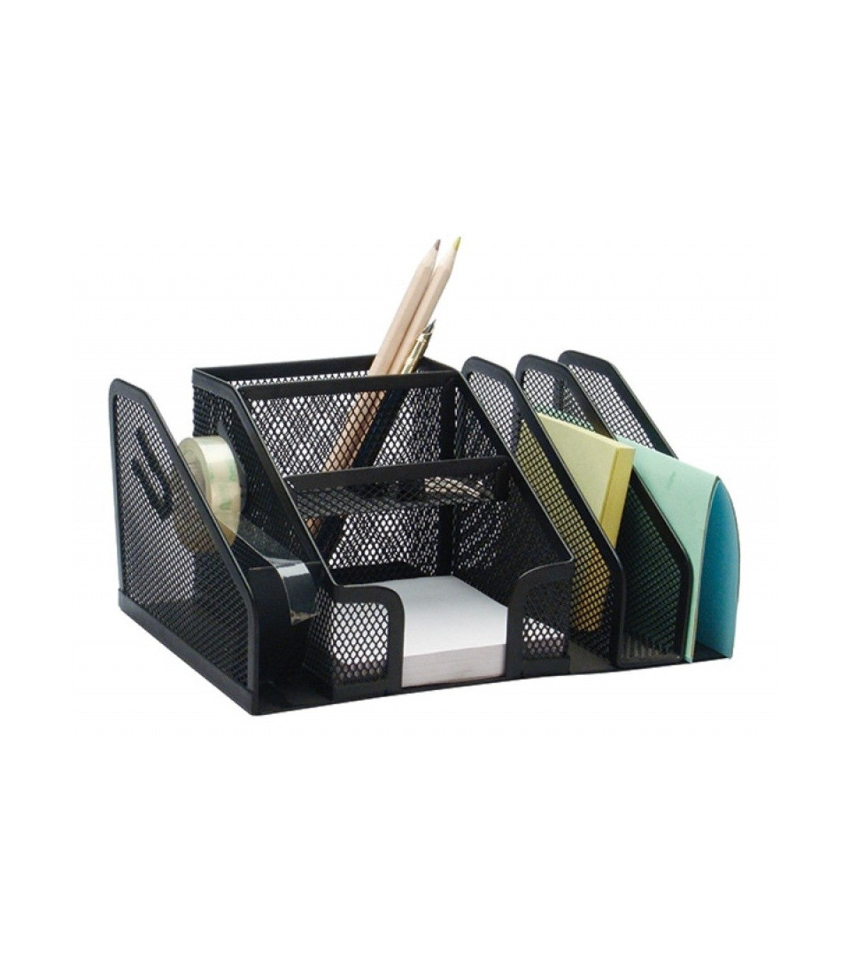 Suport pentru birou din plasa metalica. 6 compartimente si suport pentru banda adeziva (4 compartimente pentru corespondenta, 1 compartiment pentru articole de papetarie, 1 compartiment pentru accesorii mici de birou, 1 compartiment pentru foi tip memo). Picioare de cauciuc care previn alunecarea. Dimensiune: 205 x 145 x 100 mm.